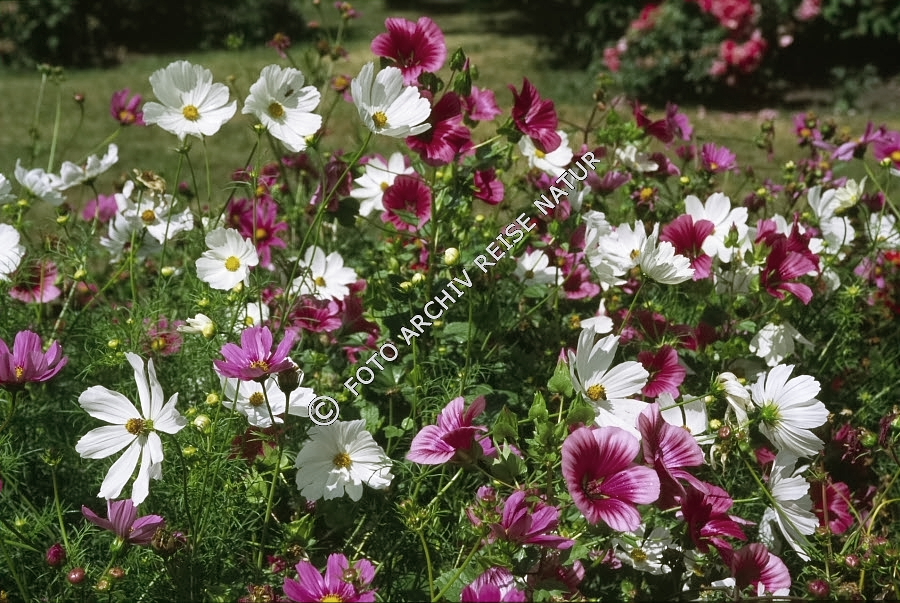 Bechermalven, Lavatera trimestris, Blume, Blumenrabatte, Flora, Korbblütler, Malvengewächs, Schmuckkörbchen, Cosmos bipinnatus,