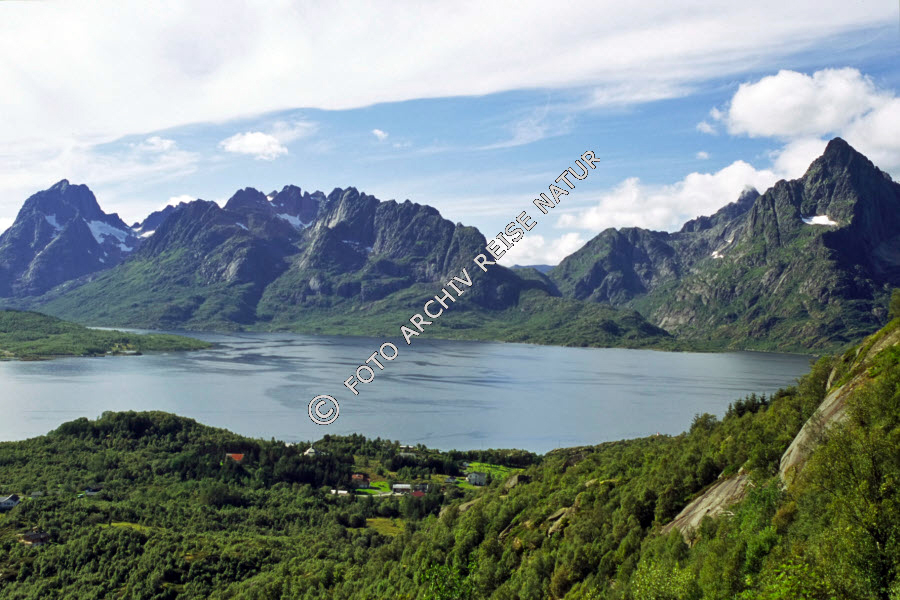 Austvågøya, Berg, Bergkette, Digermulen, Gebirge, Gewässer, Hinnøya, Landschaft, Lofoten, Nordland, Norwegen, Raftsundet, Sund, Süd-Hinnøy,