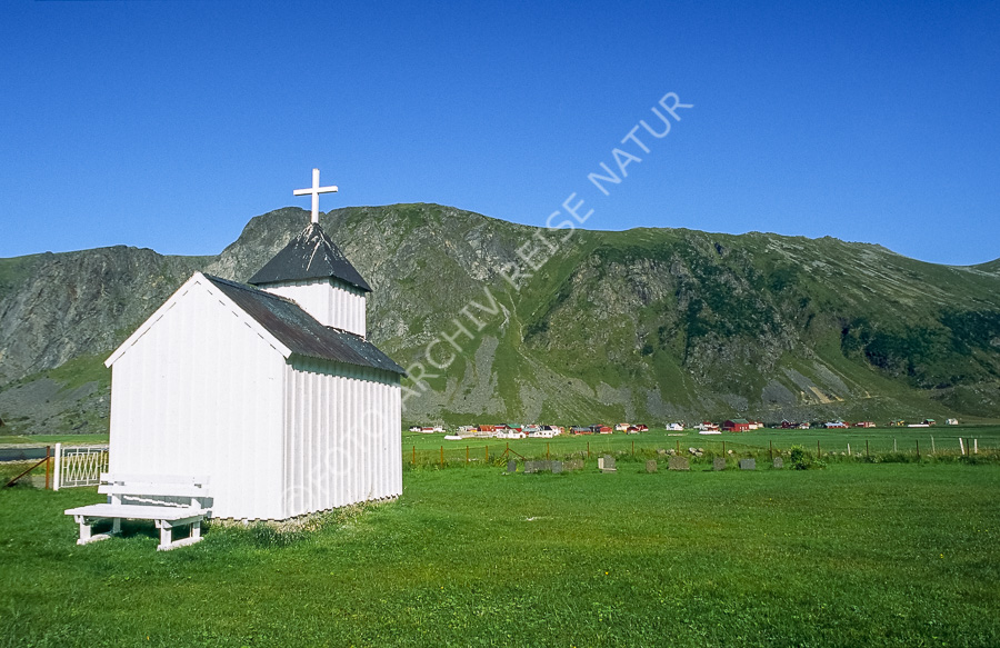Bauwerk, Berg, Dorf, Flora, Gebäude, Gras, Kapelle, Kulturlandschaft, Landschaft, Lofoten, Nordland, Norwegen, Sakralbau, Unnstad, Vestvågøy, Weide, Weiler,