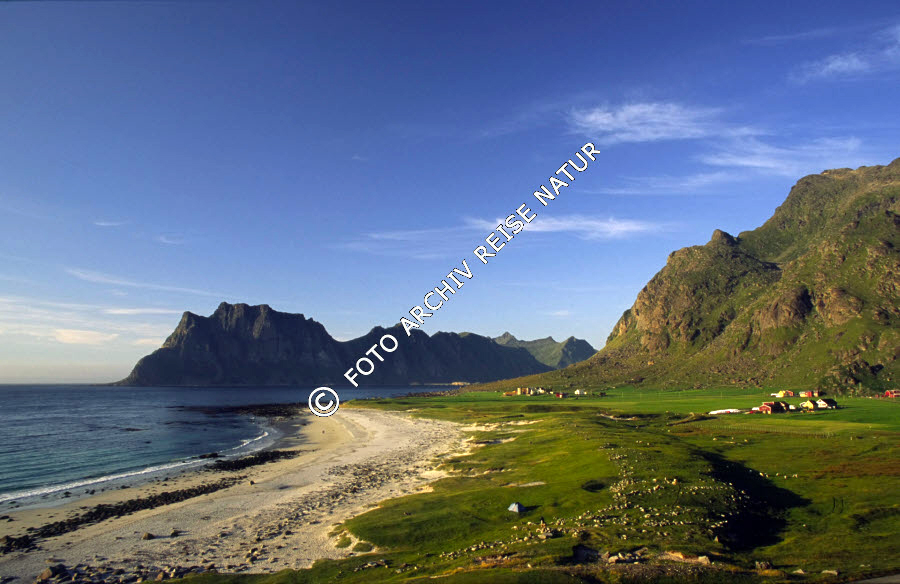 Keywords: Berg, Bergkette, Brandungsgeröll, Dorf, Felsen, Fjord, Flora, Gebirge, Geröll, Gewässer, Gras, Kulturlandschaft, Landschaft, Lofoten, Material, Meer, Nordland, Nordmeer, Norwegen, Sandstrand, Stein, Steinsfjorden, Strand, Utakleiv, Vestvågøy, Weide, Weiler,