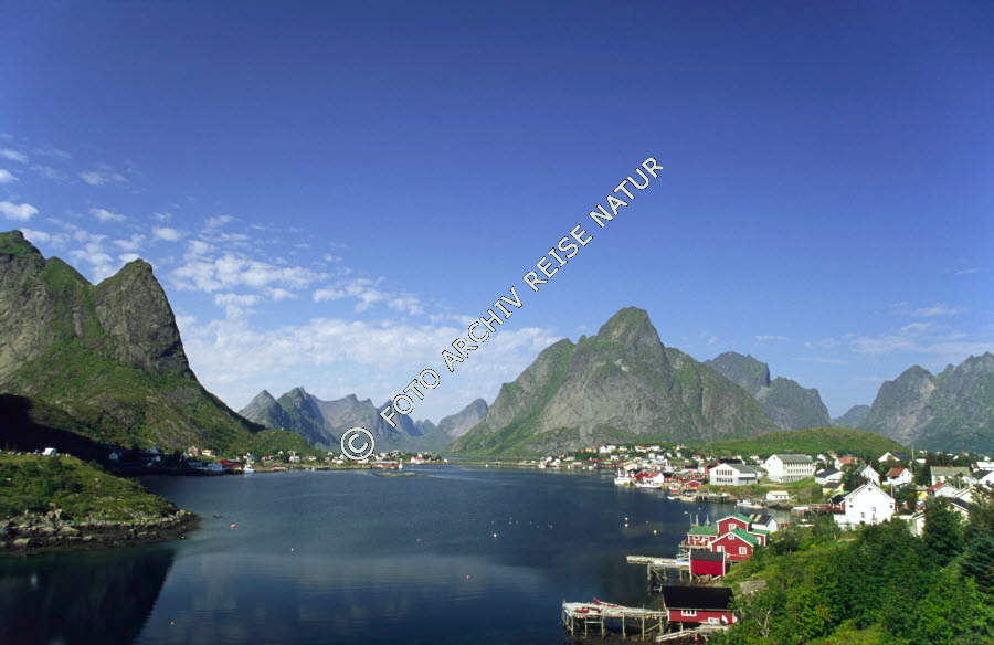 Keywords: Berg, Berghang, Bergkette, Dorf, Fischerdorf, Fjord, Gebirge, Gewässer, Kulturlandschaft, Landschaft, Lofoten, Moskenesøy, Nordland, Norwegen, Reine, Reinefjorden,