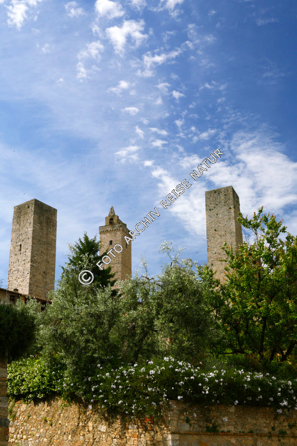 Keywords: Altstadt, Bauwerk, Blütenstrauch, Flora, Geschlechterturm, Italien, Kulturlandschaft, San Gimignano, Stadt, Strauch, Toskana, Turm,