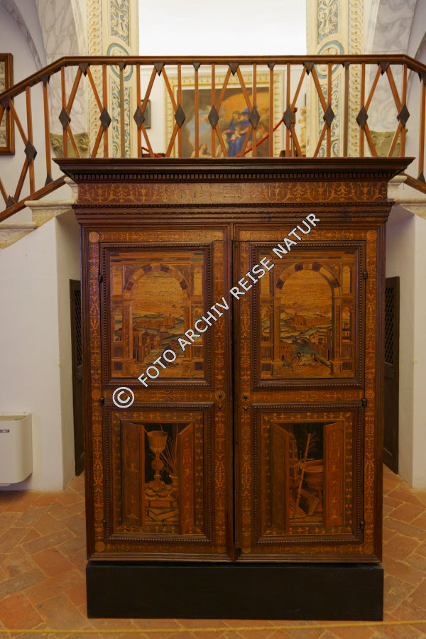 Abtei, Kloster, Bauwerk, Crete, Gebäude, Gegenstand, Intarsie, Italien, Kultur, Kunst, Kunsthandwerk, Monte Oliveto, Möbel, Sakralbau, Schrank, Toskana,