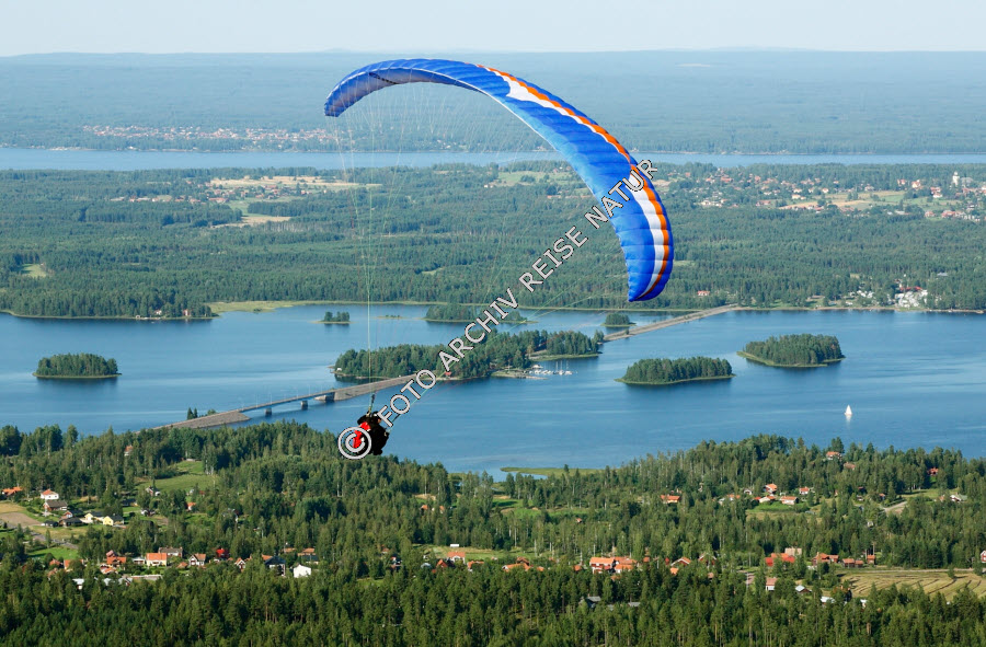 Keywords: Aktivität, Dalarna, Ereignis, Freizeit, Freizeitsportler, Gesunda, Gesundaberget, Gewässer, Gleitschirmfliegen, Insel, Landschaft, Mora, Person, Schweden, See, Siljan, Sportler, Wald,
