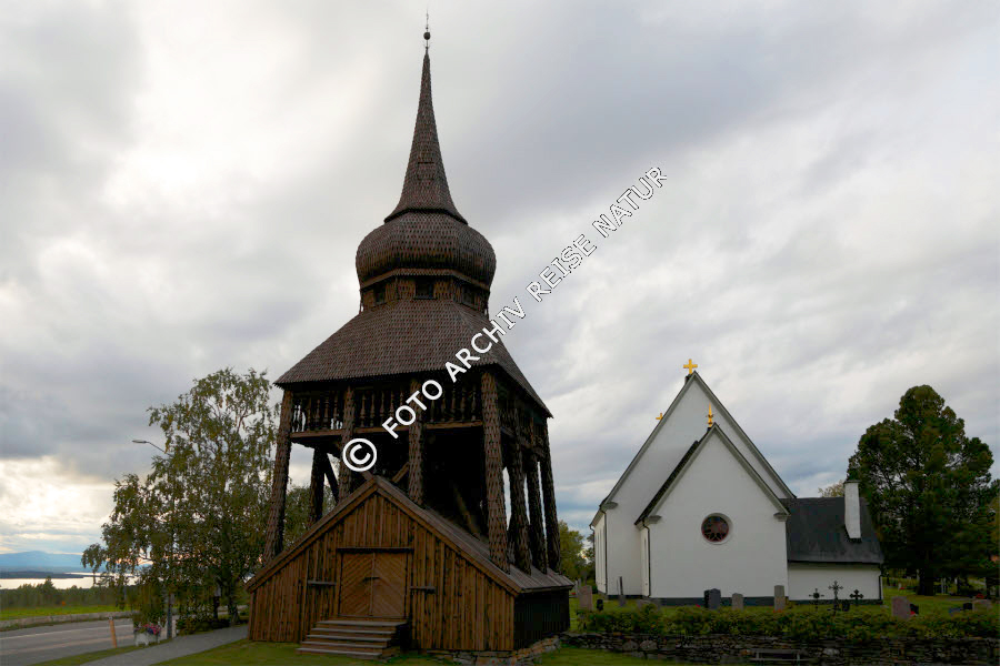 Glockenturm und Frösö kyrka auf Frösön. Kirche aus Stein 12 Jhd. und freistehender Glockenturm aus Holz. 2007_09_05_1240_2089