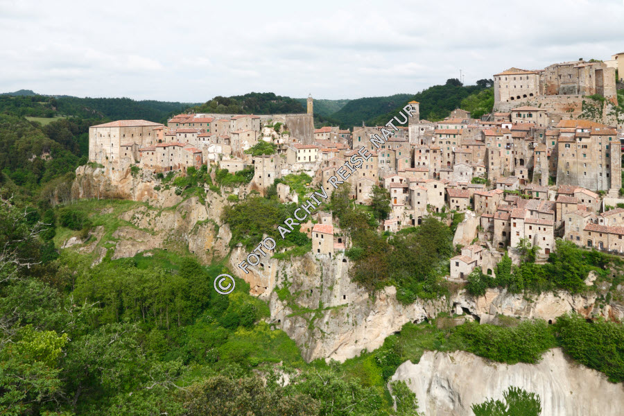 Bauwerk, Felsen, Flora, Gebäude, Haus, Italien, Kirche, Kirchturm, Kulturlandschaft, Landschaft, Material, Naturstein, Natursteinhaus, Sakralbau, Sorano, Stadt, Stadtansicht, Stein, Strauch, Toskana, Tuff, Turm, Wald,