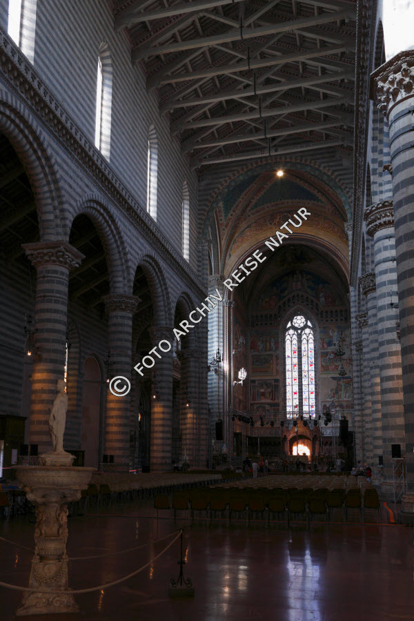 Keywords: Baustil, Bauwerk, Becken, Bleiglasfenster, Dach, Dachstuhl, Fenster, Gebäude, Gebäudeteil, Gegenstand, Gotik, Italien, Kapitell, Kirche, Kirchenschiff, Mittelschiff, Orvieto, Romanik, Sakralbau, Säule, Taufbecken, Umbrien,