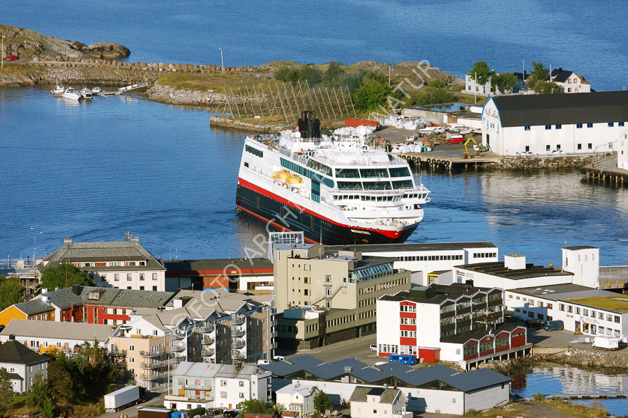 Hurtigrutenschiff bei der Einfahrt in den Hafen von Svolvær