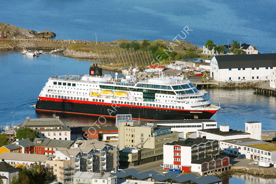 Hurtigrutenschiff bei der Einfahrt in den Hafen von Svolvær