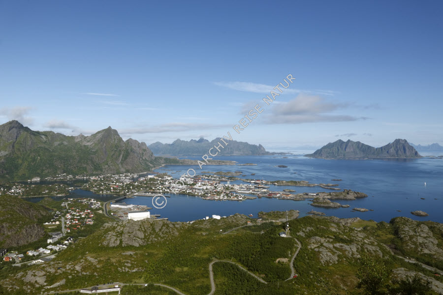 Austvågøya, Bauwerk, Berg, Fahrweg, Felsen, Fjord, Gewässer, Insel, Kulturlandschaft, Landschaft, Litlmolla, Lofoten, Material, Nordland, Norwegen, Schäre, Stadt, Stadtansicht, Stein, Stormolla, Svolvær, Tjeldbergtinden, Verkehrsweg, Vestfjorden, Wald, Weg,