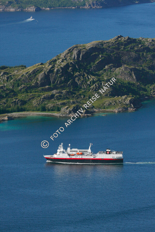 Hurtigrutenschiff bei Insel Brakøya im Raftsund