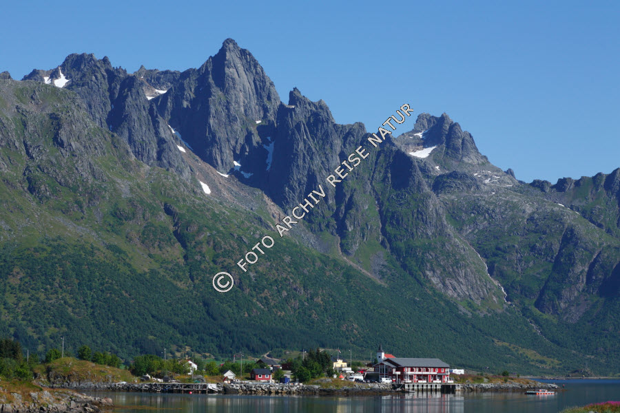Austnesfjorden, Austvågøya, Bergkette, Bergmassiv, Bergwald, Felsen, Felswand, Fjord, Gebirge, Gewässer, Landschaft, Lofoten, Material, Nordland, Norwegen, Sildpollen, Stein, Wald,
