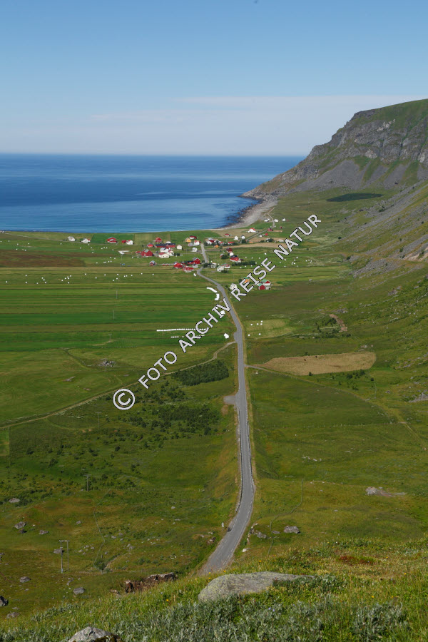Bauwerk, Berg, Bucht, Dorf, Flora, Gewässer, Gras, Kulturlandschaft, Landschaft, Lofoten, Meer, Nordland, Nordmeer, Norwegen, Straße, Unnstad, Verkehrsweg, Vestvågøy, Weide, Weiler,