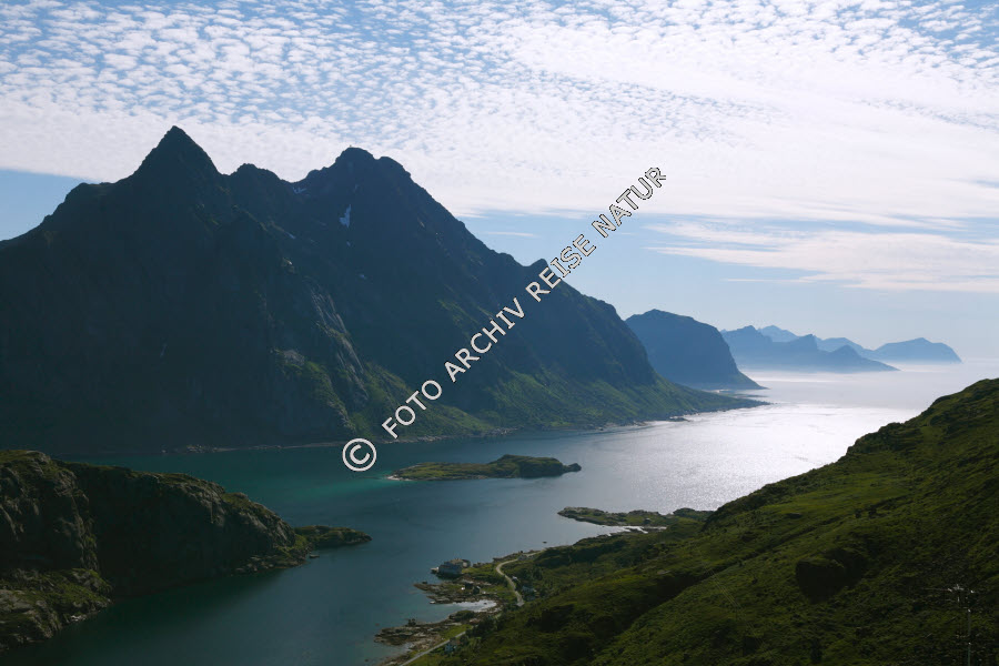 Keywords: Bauwerk, Berg, Berghang, Dorf, Fjord, Gewässer, Insel, Kulturlandschaft, Landschaft, Lofoten, Nordland, Norwegen, Schäfchenwolke, Cirrocumulus, Steinsfjorden, Straße, Unnstad, Verkehrsweg, Vestvågøy, Weiler, Wetter, Klima, Wolke,
