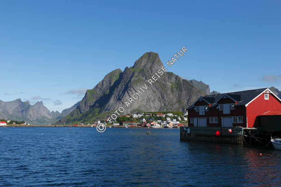 Bauwerk, Bergkette, Bergmassiv, Dorf, Felsen, Felswand, Fischerdorf, Fjord, Gebirge, Gebäude, Gewässer, Haus, Holzhaus, Kulturlandschaft, Lagerhaus, Landschaft, Lofoten, Material, Moskenesøy, Nordland, Norwegen, Reine, Reinefjorden, Stein,