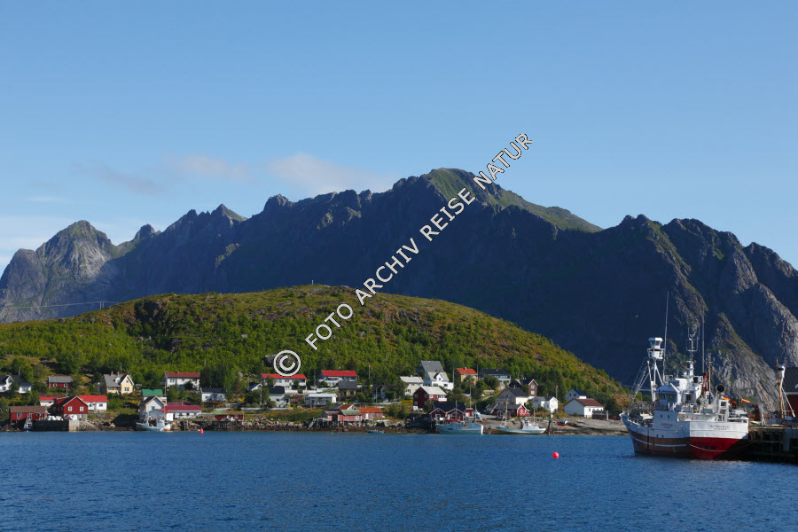 Berg, Dorf, Fischerdorf, Fjord, Gewässer, Kulturlandschaft, Landschaft, Lofoten, Moskenesøy, Nordland, Norwegen, Reine, Reinefjorden,