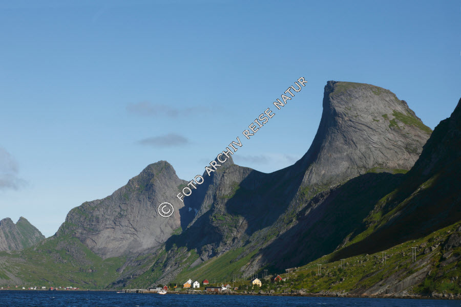 Keywords: Berg, Dorf, Felsen, Felswand, Fjord, Gewässer, Kjerkfjorden, Kulturlandschaft, Landschaft, Lofoten, Material, Moskenesøy, Nordland, Norwegen, Rostad, Stein, Weiler,