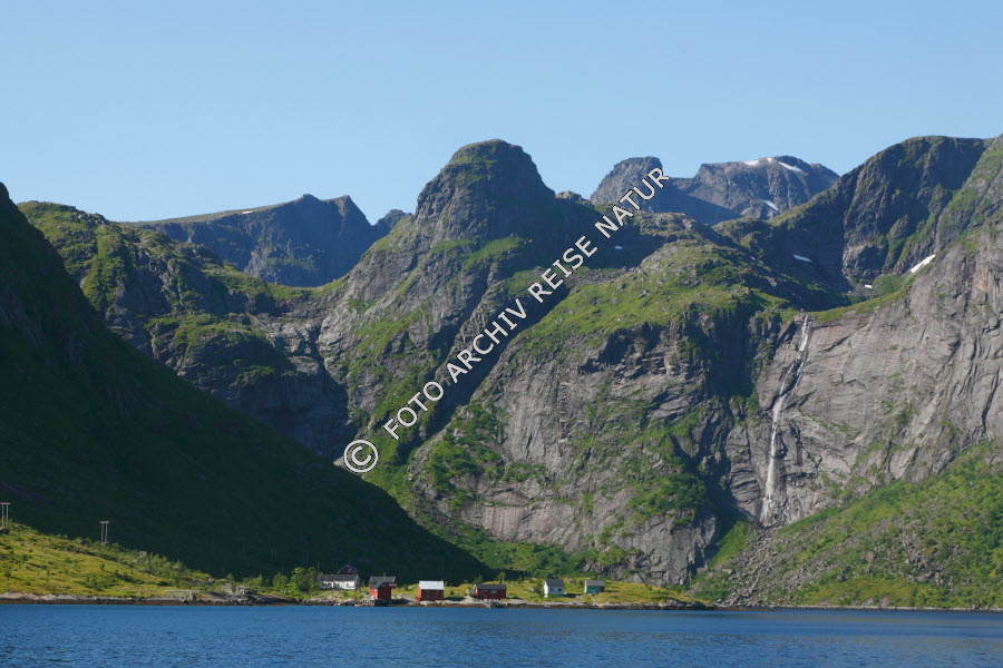 Berg, Berghang, Dorf, Felsen, Felswand, Fjord, Forsfjorden, Gewässer, Kulturlandschaft, Landschaft, Lofoten, Material, Moskenesøy, Nordland, Norwegen, Stein, Vindstad, Wasserfall, Weiler,