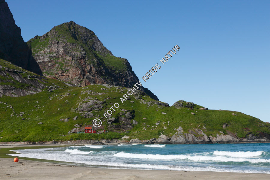 Keywords: Bauwerk, Berg, Buneset, Felsen, Ferienhaus, Gebäude, Gewässer, Haus, Holzhaus, Landschaft, Lofoten, Material, Meer, Moskenesøy, Nordland, Nordmeer, Norwegen, Sandstrand, Stein, Strand,