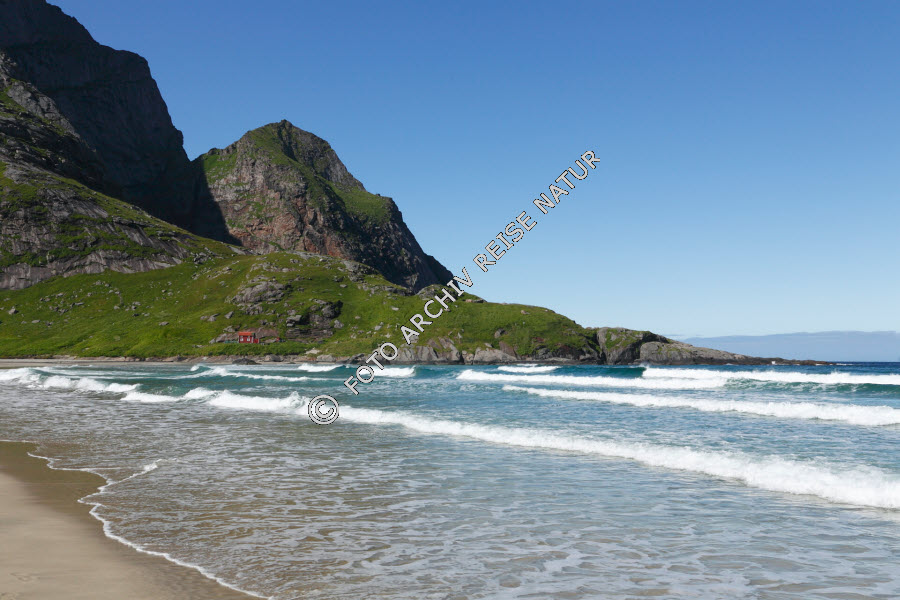Keywords: Bauwerk, Berg, Buneset, Felsen, Ferienhaus, Gebäude, Gewässer, Haus, Holzhaus, Landschaft, Lofoten, Material, Meer, Moskenesøy, Nordland, Nordmeer, Norwegen, Sandstrand, Stein, Strand,