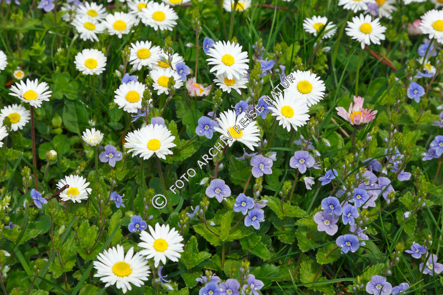 Keywords: Blume, Ehrenpreis, Veronica, Farbe, Flora, Gänseblümchen, Bellis perennis, Korbblütler, Lago Maggiore, Locarno, Pflanzenteil, Schweiz, Tessin, Wegerichgewächs, blau, weiß,