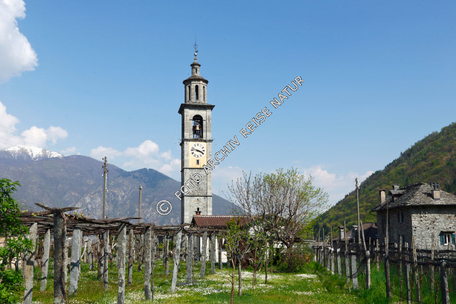 Bauwerk, Berg, Bergkette, Bergmassiv, Gebirge, Gebäude, Gegenstand, Glocke, Haus, Intragna, Kirchturm, Kulturlandschaft, Landschaft, Rasen, Schweiz, Tessin, Turm, Wald, Weingarten, Wiese,