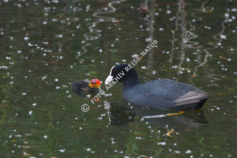 Blässhuhn füttert Küken