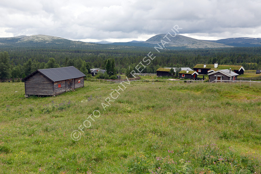 Keywords: Alm, Bauwerk, Gebirge, Gebäude, Holzhütte, Hütte, Kulturlandschaft, Landschaft, Norwegen, Oppland, Skjerdingen, Wald, Weide,