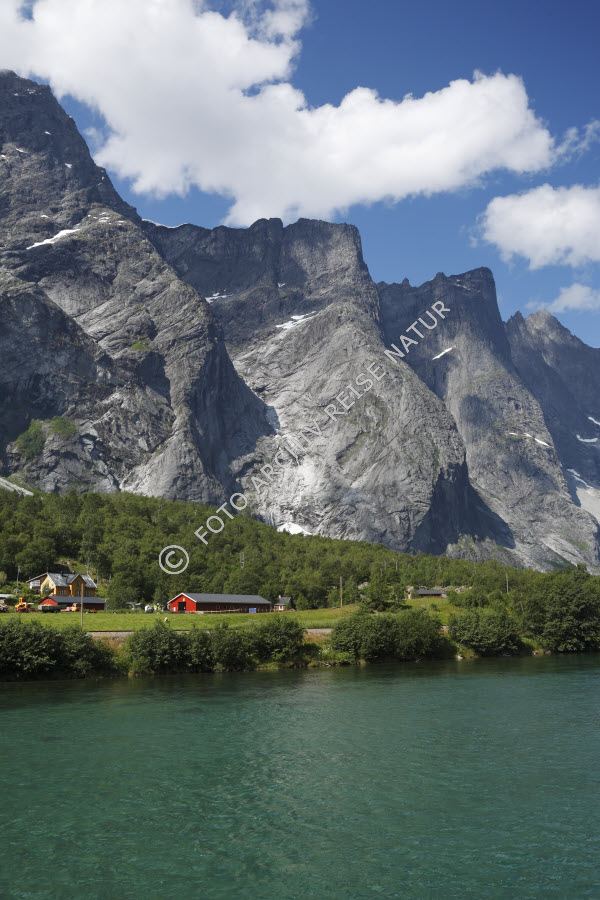 Keywords: Bauernhof, Bauwerk, Berg, Bergkette, Bergmassiv, Flora, Fluss, Gebirge, Gebäude, Gewässer, Hof, Landschaft, Møre og Romsdal, Norwegen, Rauma, Romsdalen, Strauch, Wald,