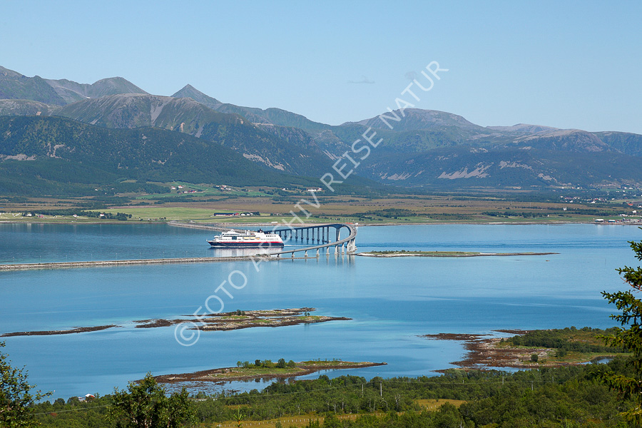 Bauwerk, Berg, Brücke, Fahrzeug, Fjord, Gebirge, Gewässer, Hadseløya, Hurtigrute, Landschaft, Langøysundet, Nordland, Norwegen, Postschiff, Schiff, Verkehrsmittel, Verkehrsweg, Vesterålen, Wald, Wasserfahrzeug,