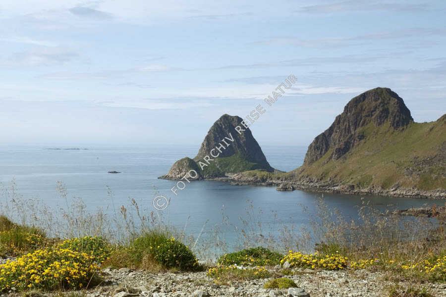Berg, Blume, Bucht, Felsen, Felswand, Flora, Gewässer, Gras, Landschaft, Langøya, Material, Meer, Nordland, Nordmeer, Norwegen, Nykvåg, Stein, Strand, Vesterålen,