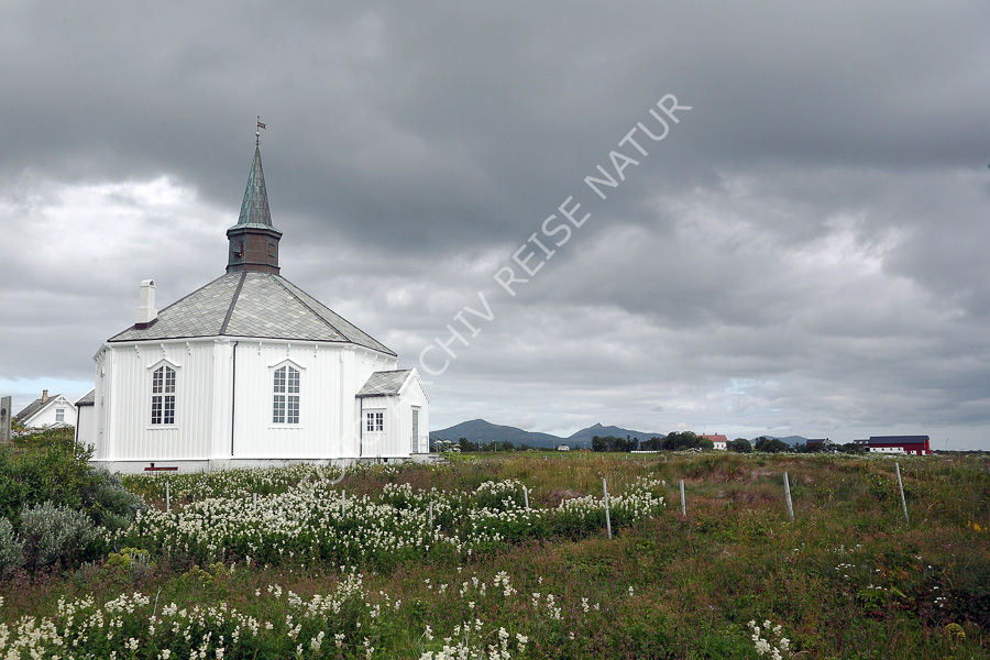 Andøya, Bauwerk, Dverberg, Echtes Mädesüß, Filipendula ulmaria, Flora, Gebäude, Holzkirche, Kirche, Kirchturm, Nordland, Norwegen, Rosengewächs, Sakralbau, Turm, Vesterålen, Wetter, Klima, Wolke,