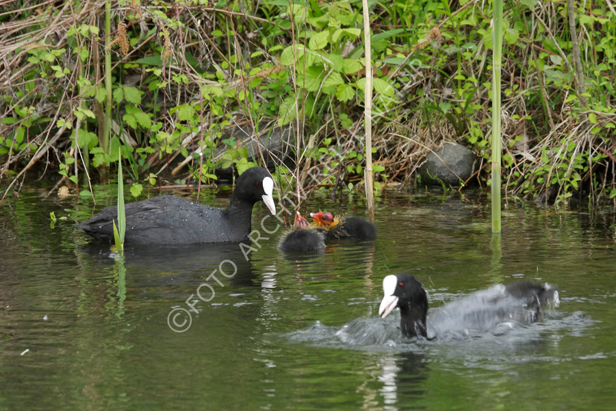 Blässhuhn füttert Küken