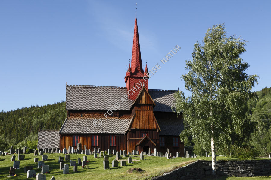 Baum, Bauwerk, Birke, Betula, Birkengewächs, Dach, Flora, Friedhof, Gebäude, Gebäudeteil, Holzkirche, Kirche, Kirchturm, Landschaft, Mauer, Natursteinmauer, Norwegen, Oppland, Ort, Ringebu, Sakralbau, Schindeldach, Stabkirche, Turm, Wald,