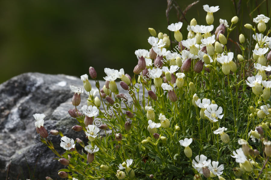 Keywords: Blume, Farbe, Felsbrocken, Felsen, Flora, Insel, Insel Runde, Landschaft, Material, Møre og Romsdal, Nelkengewächs, Norwegen, Stein, Taubenkropf-Leimkraut, Silene vulgaris, Wildpflanze, grün, violett, weiß,