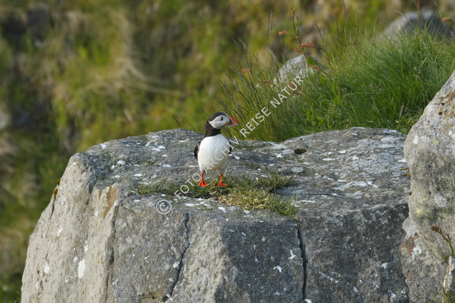 Alkenvögel, Farbe, Fauna, Felsblock, Felsbrocken, Felsen, Flora, Gras, Insel, Insel Runde, Landschaft, Material, Møre og Romsdal, Norwegen, Papageitaucher, Fratercula arctica, Stein, Vogel, Wiese, Wiesenhang, grün, rot, schwarz, weiß,