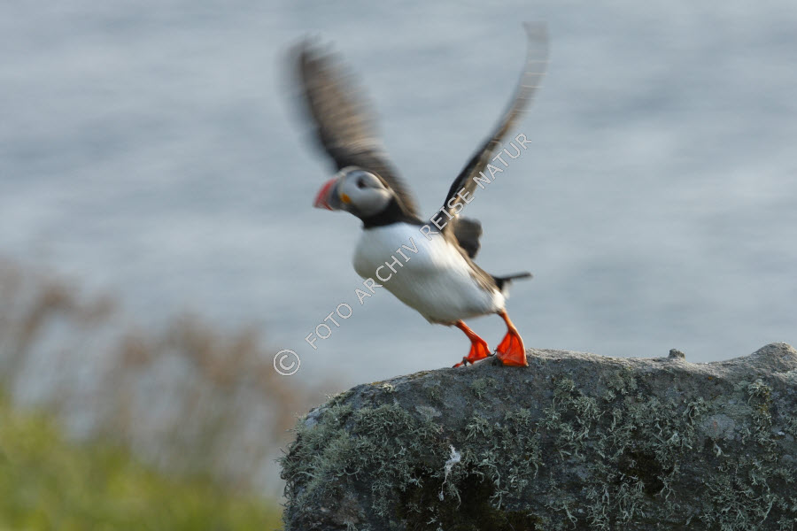Keywords: Alkenvögel, Bewegen, Ereignis, Farbe, Fauna, Felsblock, Felsbrocken, Felsen, Flattern, Fliegen, Flora, Geschehen, Gras, Insel, Insel Runde, Landschaft, Material, Møre og Romsdal, Norwegen, Papageitaucher, Fratercula arctica, Stein, Tätigkeit, Vogel, Wiese, Wiesenhang, rot, schwarz, weiß,