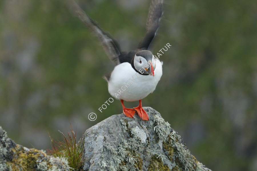 Keywords: Alkenvögel, Bewegen, Ereignis, Farbe, Fauna, Felsblock, Felsbrocken, Felsen, Fliegen, Flora, Geschehen, Gras, Insel, Insel Runde, Landschaft, Material, Møre og Romsdal, Norwegen, Papageitaucher, Fratercula arctica, Stein, Tätigkeit, Vogel, rot, schwarz, weiß,