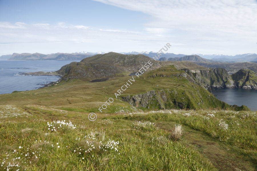Berg, Berghang, Bergkette, Farbe, Felsen, Felsklippe, Felsküste, Flora, Gebirge, Gewässer, Gras, Grasbüschel, Insel, Insel Runde, Küste, Landschaft, Material, Meer, Møre og Romsdal, Nordmeer, Norwegen, Sauergrasgewächs, Scheuchzers Wollgras, Eriophorum scheuchzeri, Steilküste, Stein, Wiese, Wiesenhang, blau, grün,
