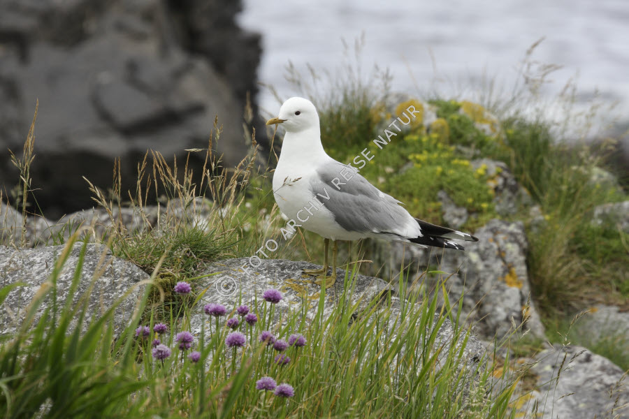 Keywords: Fauna, Felsblock, Felsbrocken, Felsen, Felsenstrand, Flora, Gewässer, Gras, Grasbüschel, Insel Runde, Landschaft, Material, Meer, Möwen, Møre og Romsdal, Nordmeer, Norwegen, Stein, Strand, Sturmmöwe, Larus canus, Vogel,