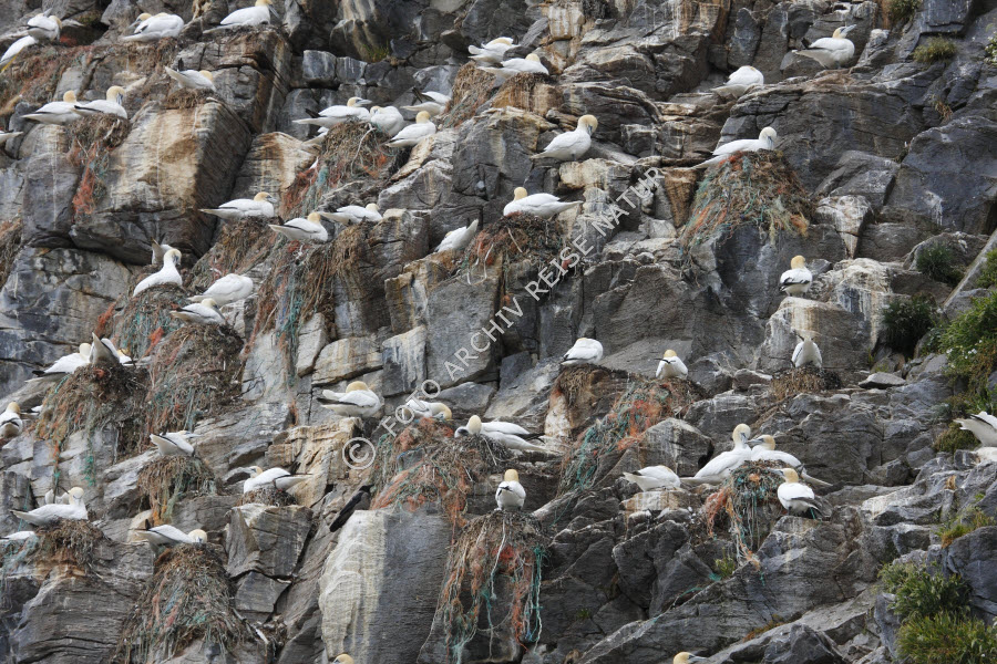Keywords: Basstölpel, Morus bassanus, Brutkolonie, Fauna, Felsen, Felsklippe, Felswand, Fischernetz, Gegenstand, Insel Runde, Kolonie, Kunststoff, Material, Møre og Romsdal, Netz, Norwegen, Nylon, Stein, Tierbau, Tölpel, Vogel, Vogelfelsen, Vogelkolonie,