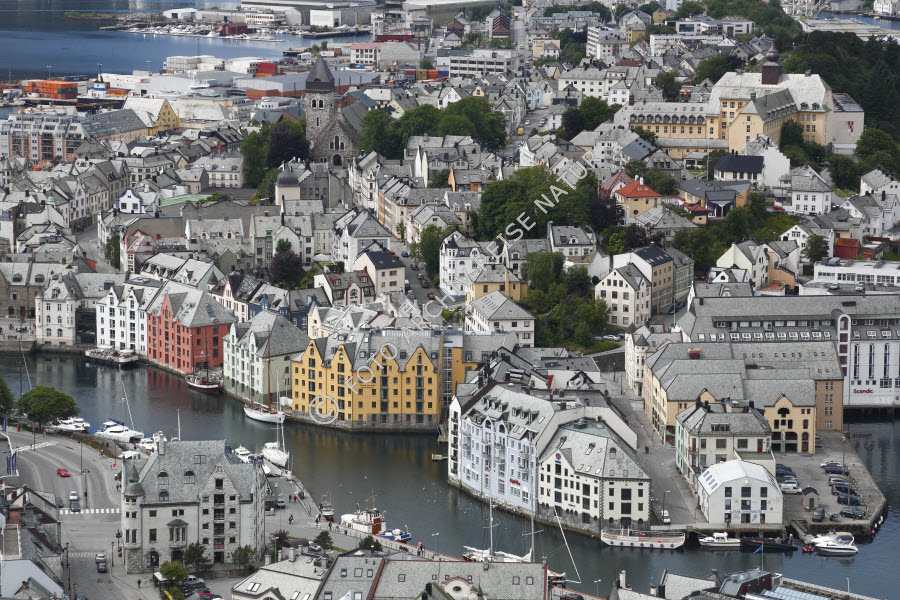 Baum, Baustil, Bauwerk, Dach, Dachgaube, Farbe, Flora, Gebäude, Gebäudeteil, Gewässer, Giebel, Hafenstadt, Jugendstil, Kirche, Kulturlandschaft, Landschaft, Meer, Møre og Romsdal, Natursteinkirche, Nordmeer, Norwegen, Sakralbau, Schindeldach, Stadt, Stadtansicht, Steinkirche, gelb, rot, Ålesund,