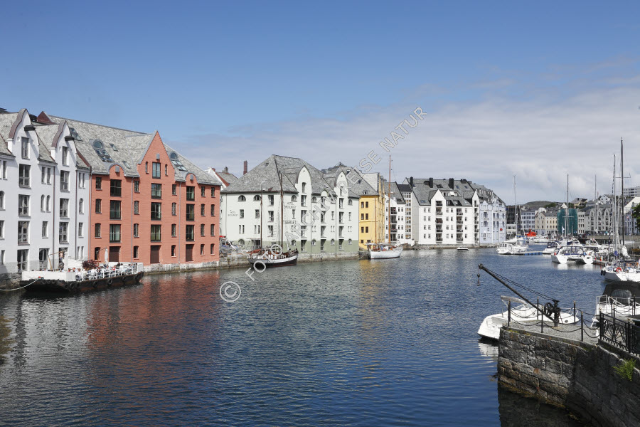 Keywords: Baustil, Bauwerk, Bootsanleger, Dach, Dachgaube, Gebäudeteil, Gewässer, Giebel, Hafen, Hafenmauer, Hafenstadt, Jugendstil, Kai, Kulturlandschaft, Landschaft, Meer, Møre og Romsdal, Nordmeer, Norwegen, Stadt, Stadtansicht, Ålesund,