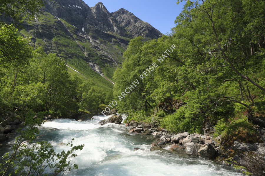 Bach, Berg, Bergkette, Bergspitze, Bergwald, Fluss, Gebirge, Gebirgsbach, Gewässer, Gipfel, Grøvdal, Landschaft, Møre og Romsdal, Norwegen, Stromschnelle, Wald, Wiese, Wiesenhang, Åndalsnes, Rauma,