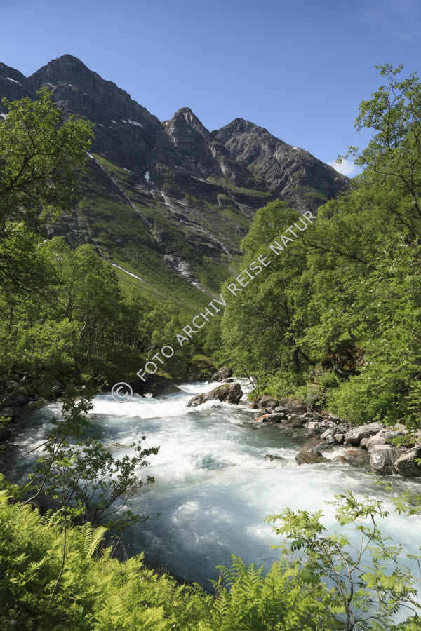 Keywords: Bach, Berg, Bergkette, Bergspitze, Bergwald, Fluss, Gebirge, Gebirgsbach, Gewässer, Gipfel, Grøvdal, Landschaft, Møre og Romsdal, Norwegen, Stromschnelle, Wald, Wiese, Wiesenhang, Åndalsnes, Rauma,