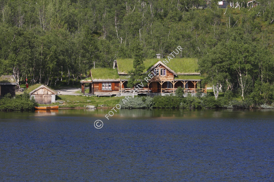 Keywords: Baum, Bauwerk, Bergsee, Birke, Betula, Birkengewächs, Bootshaus, Dach, Flora, Gebäude, Gebäudeteil, Gewässer, Gjøra, Gras, Grasdach, Haus, Holzhaus, Landschaft, Møre og Romsdal, Norwegen, See, Vangshaugen, Wald, Wiese,