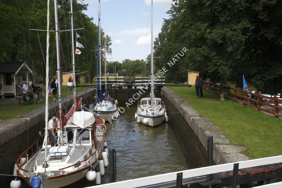 Baum, Bauwerk, Boot, Fahrzeug, Flora, Götakanal, Hajstorp, Kanal, Kulturlandschaft, Rasen, Schleuse, Schleusentor, Schweden, Segelboot, Töreboda, Verkehrsmittel, Verkehrsweg, Västra Götlands län, Wasserfahrzeug, Wiese,