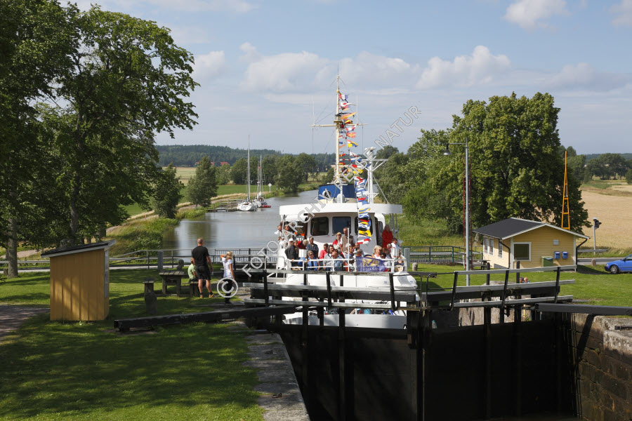 Keywords: Ausflugsdampfer, Ausflugsschiff, Baum, Bauwerk, Dampfer, Deck, Fahrzeug, Flora, Götakanal, Kanal, Kulturlandschaft, Person, Rasen, Reisender, Riksberg, Schiff, Schleuse, Schleusentor, Schweden, Töreboda, Verkehrsmittel, Verkehrsweg, Västra Götlands län, Wasserfahrzeug, Wetter, Klima, Wiese, Wolke,
