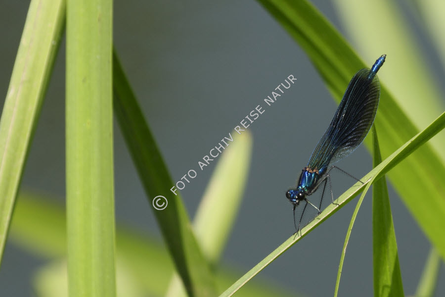 Deutschland, Farbe, Fauna, Flora, Gebänderte Prachtlibelle, Calopteryx splendens, Gras, Insekt, Libelle, Prachtlibelle,Calopterygidae, Sachsen-Anhalt, Schilfrohr , Phragmites australis, Süßgras, Wörlitz, blau, grün,