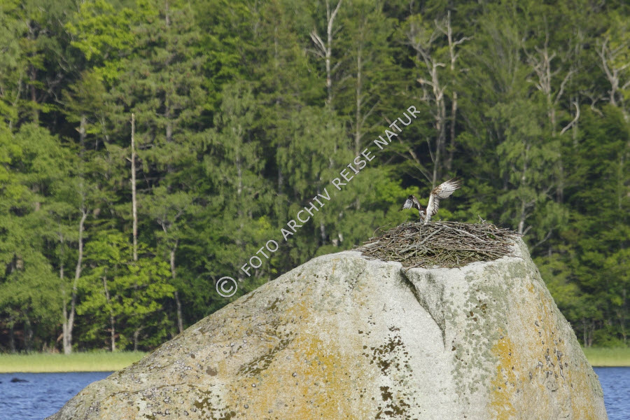 Keywords: Adlerhorst, Agnäs, Fauna, Felsblock, Felsen, Fischadler, Pandion haliaetus, Greifvögel, Material, Naturschutzgebiet, Nest, Ort, Schweden, Småland, Stein, Tierbau, Vogel,